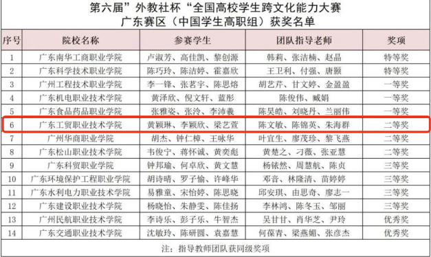11月25日,在第六届“外教社杯”全国高校学生跨文化能力大赛广东赛区中诸侯快讯官网22商英5班黄颖琳、22国贸1班李颖欣和22工设5班梁艺萱三名同学组成的团队荣获二等奖,应用外语学院陈文敏老师、陈锦英博士和朱海群老师获得优秀指导教师奖。